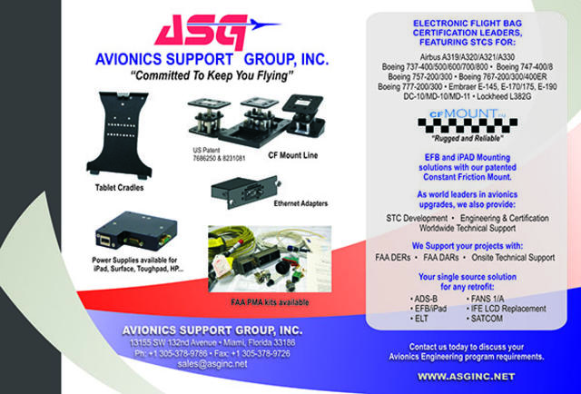 Avionics Support Group, Inc. (ASG) is a world leader in supplying EFB mounting and power solutions to commercial airlines. We are the FAA PMA-approved OEM of the Constant Friction Mount (cfMountTM). Our cfMountTM is fully U.S. pat- ented and STCd, and is currently being used by some of the world’s largest airlines. It has become the standard in the in- dustry. Additionally, we are a full engineering firm to help you if any deviations are needed during installation. Our EFB family of mounts will support several different size cradles and will allow users to select whichever tablet they choose for their selected EFB hardware. Installing the cfMountTM with our Integrated Power Supplies (IPS) and iPad Ethernet adapter will add another level of convenience and safety to your operation.